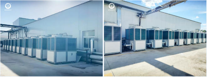 河北張北興農食用菌合作社項目則展示了科技在特色農業領域的應用價值。紐恩泰為約10000㎡食用菌大棚提供采暖解決方案,采用10臺NERS-G60KD熱泵設備,閉式循環、無人值守、零排放的運行模式,不僅降低了生產成本,更成為踐行綠色農業的示范樣板。